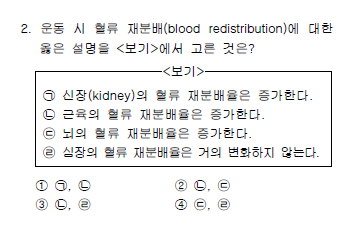 혈류재분배는 운동 시 골격근의 산소요구량이 증가해 골격근으로 가는 혈류량은 증가하고, 장기 등으로 가는 혈류는 감소하는 것이다.