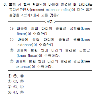 발바닥이 바늘에 찔리면 슬관절 굽힘근이 수축하게 반사적으로 수축하게 되고, 교차신근반사를 통해 반대편 슬관절이 폄근이 수축해 넘어지지 않게 됨